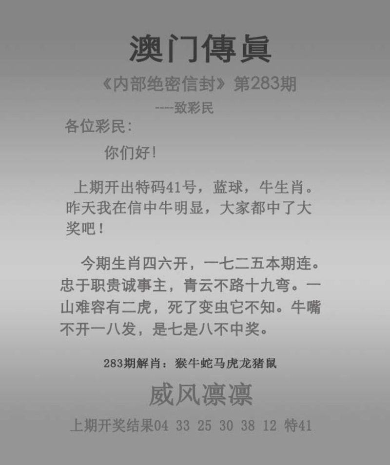 283期挂牌解析《血流如注》 解释:原指伤口破裂时血液喷射而出的状态。 解:原指伤口破裂时血液喷射而出的状态。解龙猴羊鼠蛇马,挂:01 爆:猴。 稳定六肖:猴蛇龙羊鼠马 精选四肖:猴蛇龙羊 发财一肖:猴 |